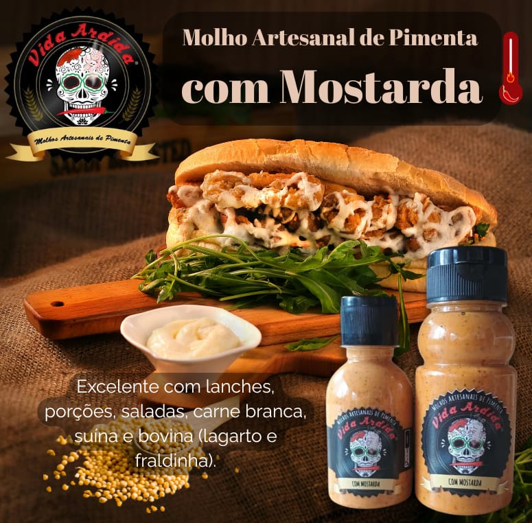 Molho artesanal de pimenta com mostarda, excelente com lanches, porções, saladas, peixes, carne branca, suína e bovina(lagarto e fraldinha).